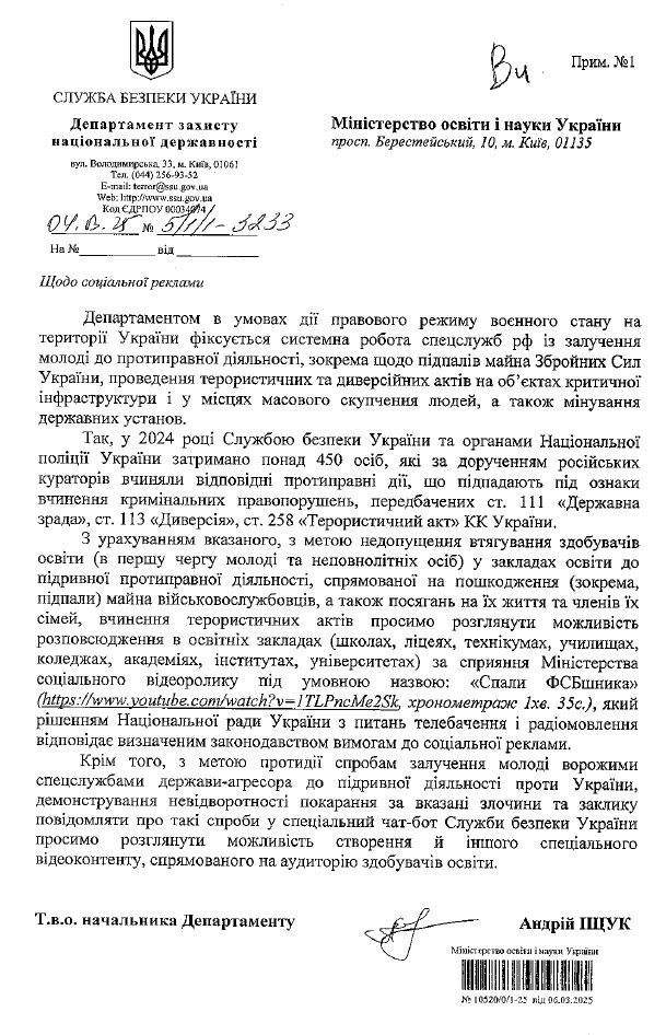 До Міністерства освіти і науки України надійшов лист Департаменту захисту національної державності Служби безпеки України від 04.03.2025 № 5/1/1-3233 стосовно недопущення втягування здобувачів освіти до підривної протиправної діяльності, спрямованої на пошкодження (зокрема підпали) майна військовослужбовців, а також посягань на їх життя та членів їх сімей, вчинення терористичних актів (додається).